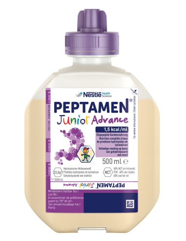 Peptamen® Junior Advance est une préparation nutritionnelle entérale équilibrée, entièrement résorbable, à base de peptides de lactosérum de faible poids moléculaire.