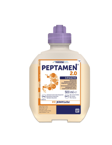 Peptamen® 2.0 est une alimentation complète à base de protéines de lactosérum hydrolysées (46g/500ml) avec 70% des lipides provenant de TCM. Grâce à cette composition, Peptamen® 2.0 convient aux patients souffrant de (risque de) dénutrition et de problèmes digestifs et/ou de syndrome de malabsorption avec des besoins énergétiques accrus et/ou une restriction nécessaire de l'apport en liquides.